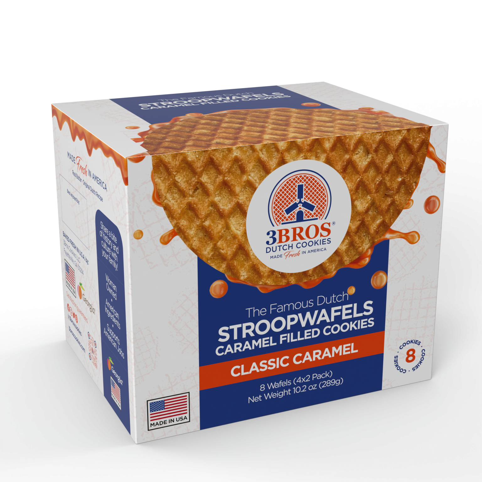 Enjoy our signature classic caramel stroopwafels in super convenient 2-packs in a box. These are made to the original and authentic Dutch recipe in the 3Bros family bakery in Fayetteville, Georgia. 3Bros stroopwafels are extra yummy when warm. Either place the stroopwafel on the rim of a cup of hot coffee or tea or microwave for 6-8 seconds.