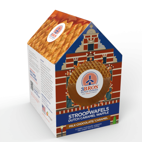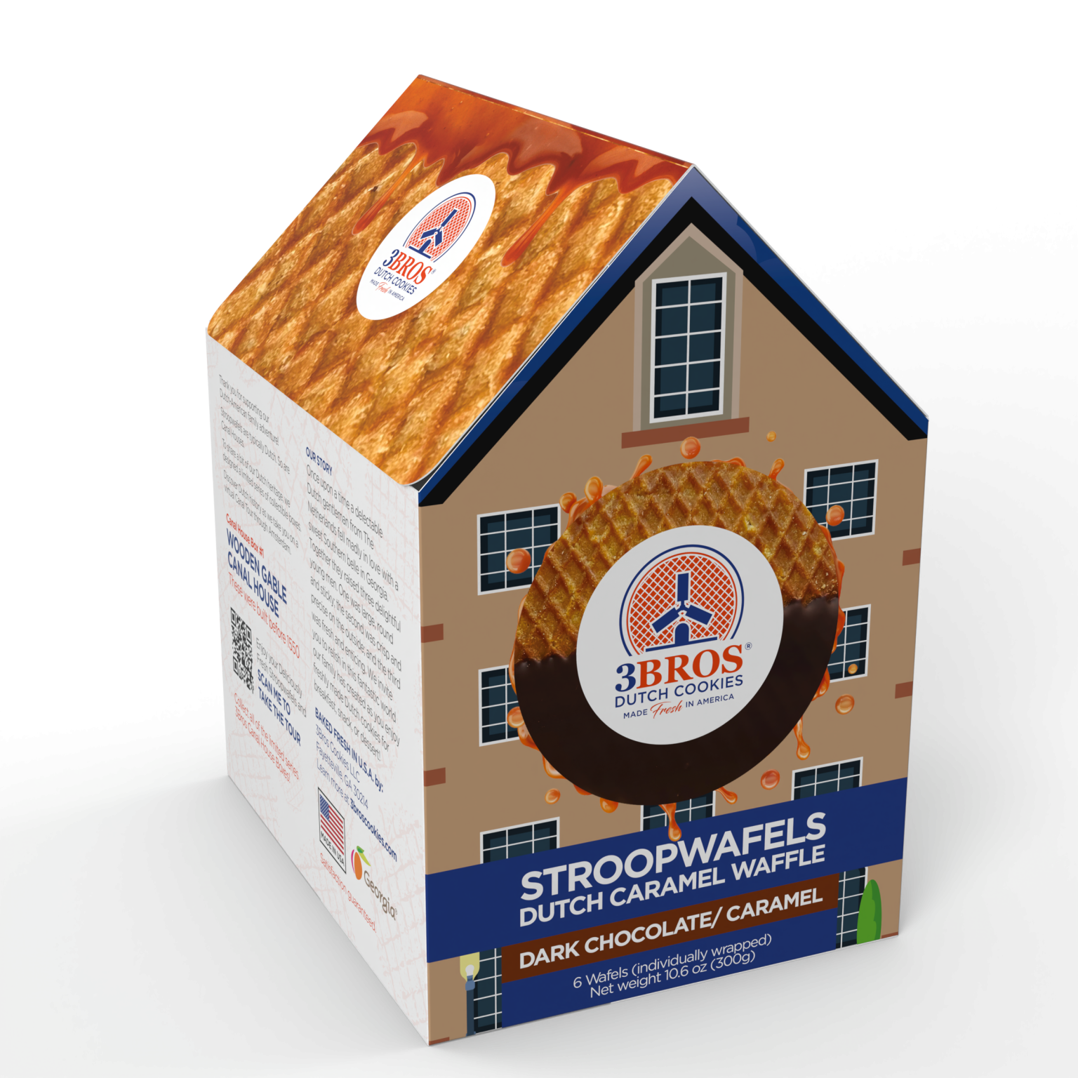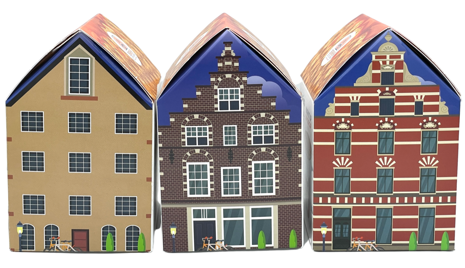 Celebrate Dutch Heritage with us with these collectible classic caramel stroopwafel packaging depicting the beloved Stepped Gabel Style of architecture, filled with a taste of the Netherlands! There is no reason to stop at just the Classic Stroopwafel, try our other collectible boxes. We have another classic caramel stroopwafel box that depicts the Bell Gabel Style of Architecture. If you are craving a bit of chocolate with your stroopwafel, we might interest you in the milk chocolate box that depicts the Neck Gabel Style, a period-era version of the stepped gable canal house. For our dark chocolate fans, we are proud to announce our dark chocolate stroopwafel box, this box depicts the wooded canal house style of architecture.